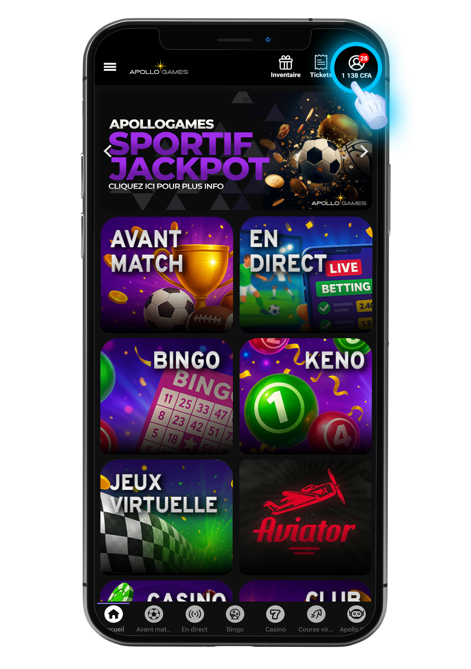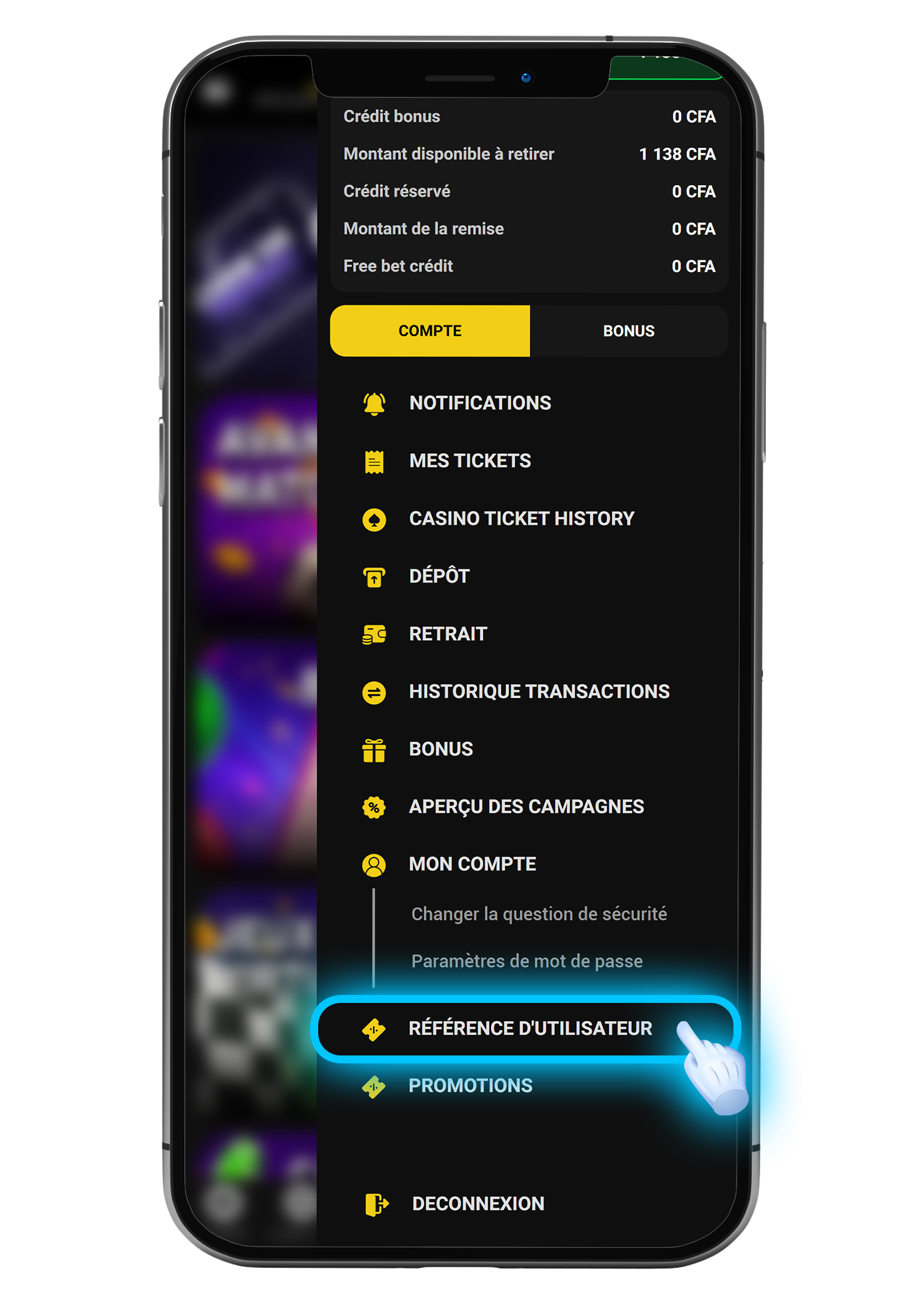Demandez-leur de s’inscrire avec votre code de parrainage, d’effectuer un dépôt minimum de 1 000 CFA et de miser au moins 1 000 CFA sur les paris sportifs (Avant-match et Live) afin que vous puissiez recevoir un ticket gratuit d’une valeur de 500 CFA !