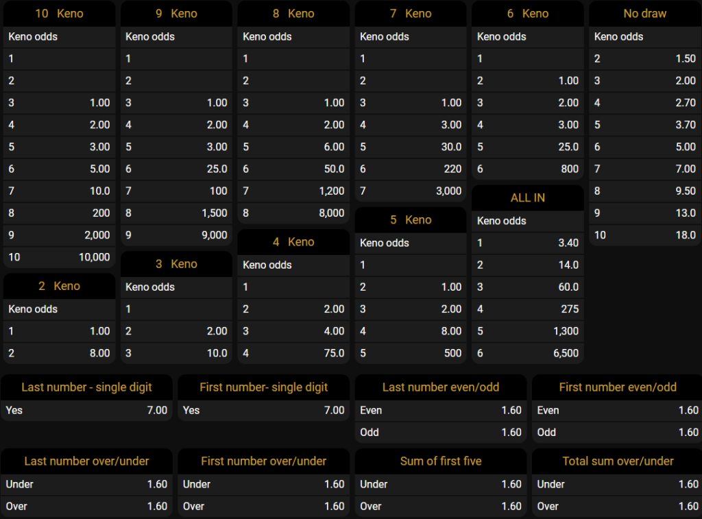 In each round, 20 out of 80 numbers are drawn, where the player has the option to choose from placing a bet on 2 up to 10 numbers.